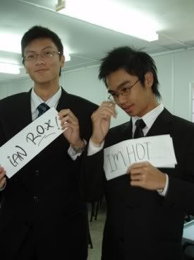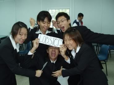 Oh ya... i finally got a new camera and its a Olympus digital 800... bloody eight mega pixels and its so much fun... plenty of functions and stuffs.. and what better time to test the shot then during our P.O.M presentation... hahahahahaz... there was so many pieces of paper after our presentation... we got crazy and started taking pics with words like "marvelouse", "I'm Hottest", "Lobster" and many more...